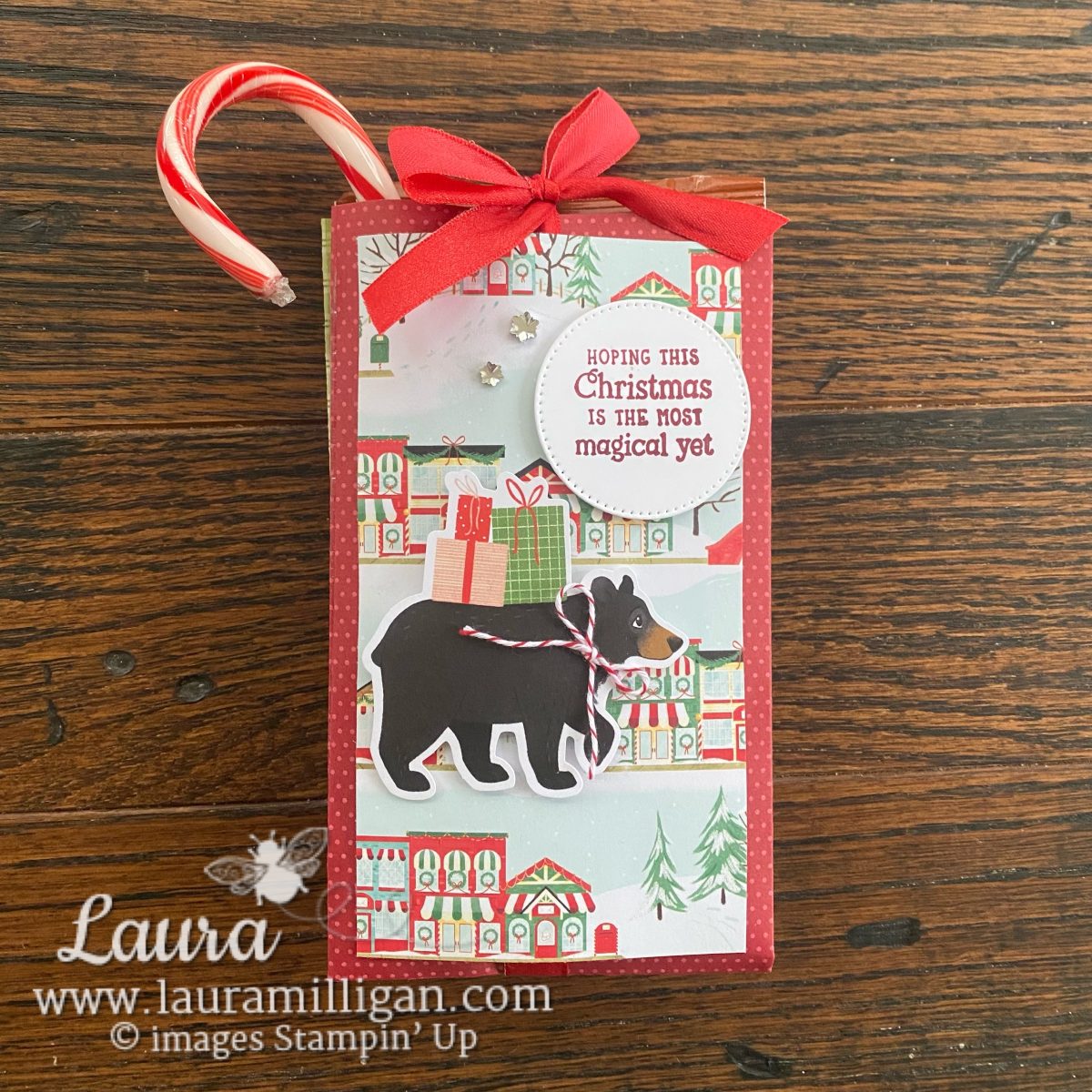 This creates a tall, sleek pouch that looks incredibly polished with a bit of ribbon at the top. I used coordinating Designer Series Paper and embellishments to tie everything together, and it made the project feel ready for a holiday market booth.