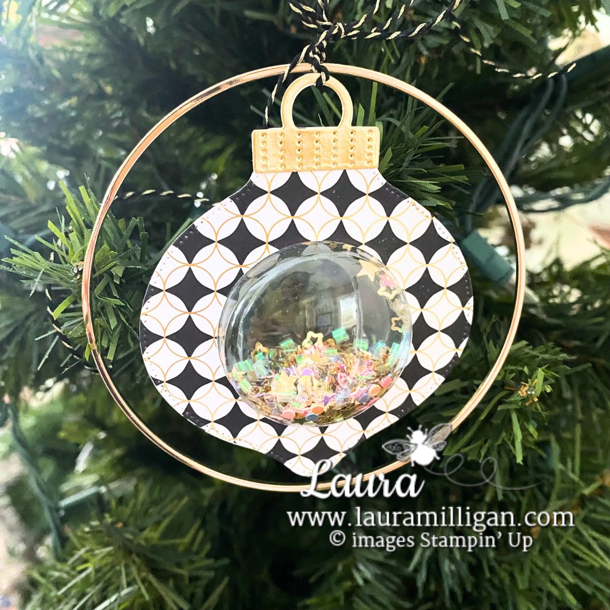 This ornament comes together with just a few key pieces, and the star of the show is definitely the shaker dome! I filled it with iridescent sequins for a sparkling, snow-globe effect that catches the lights on the tree beautifully. The bold black, white, and gold designer paper from the suite gives it a modern, fresh look while still feeling classic Christmas.
